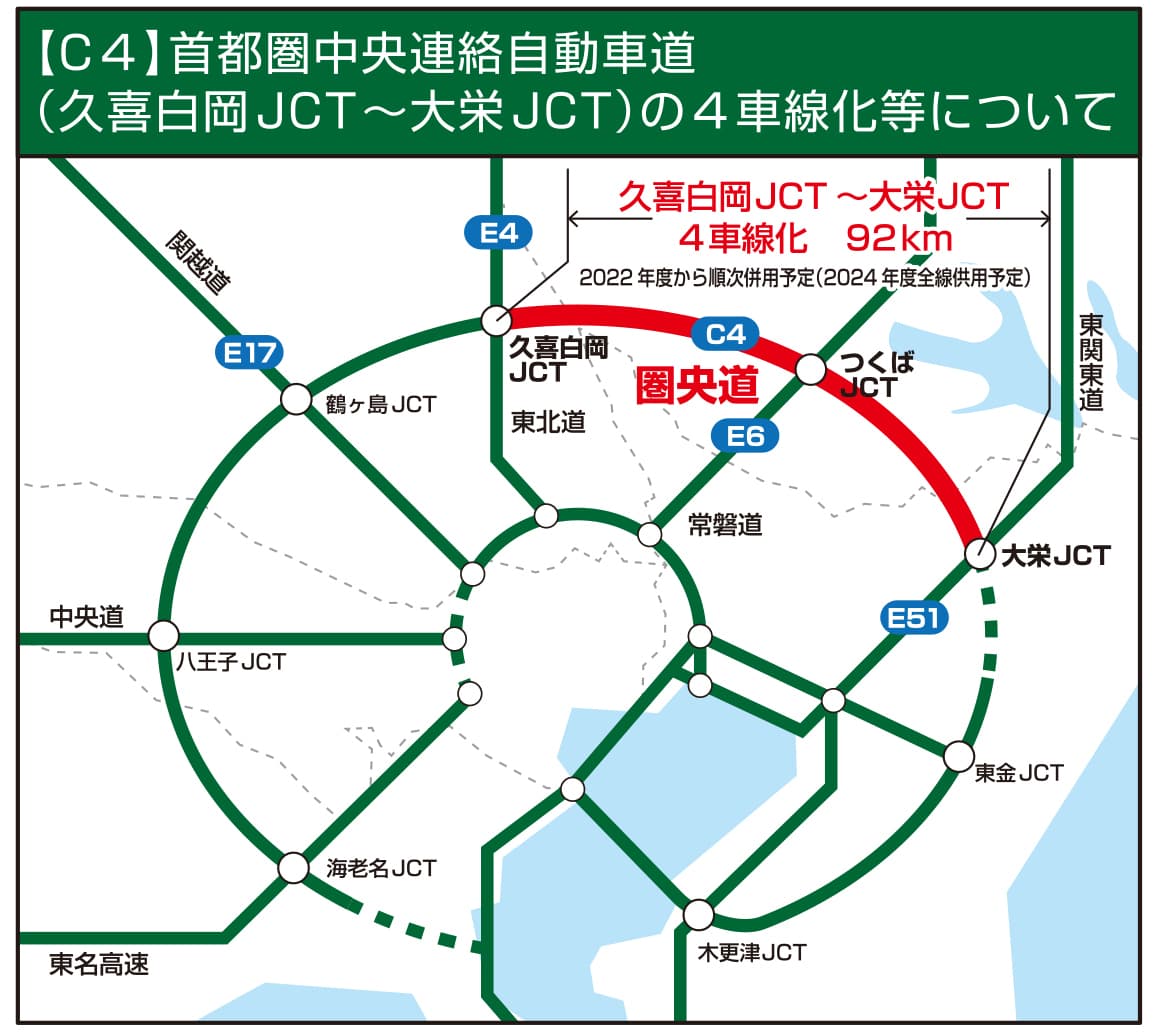 平成30年3月30日に国土交通大臣の事業許可を受けた首都圏中央連絡自動車道(圏央道) 久喜白岡JCT~大栄JCT(92km)の四車線化が2022年度から順次供用されます。完成予定は2024年度です。圏央道の4車線化に伴い、交通網がさらに発展する久喜市をさらに良くするため、スマートインターチェンジ実現に努めます。